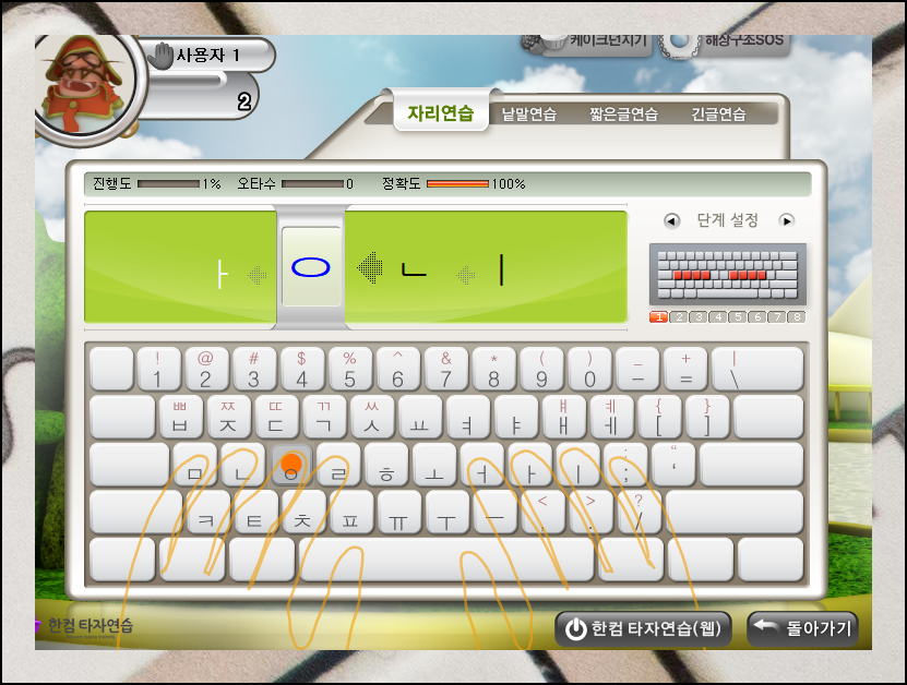 처음에는 각 손가락의 위치와 담당 키를 익혀야 합니다. 그림으로 상세히 설명되어 있어 기본적인 사용방법을 쉽게 익힐 수 있어요. 진행 상황과 정확도도 실시간으로 확인 가능합니다.
