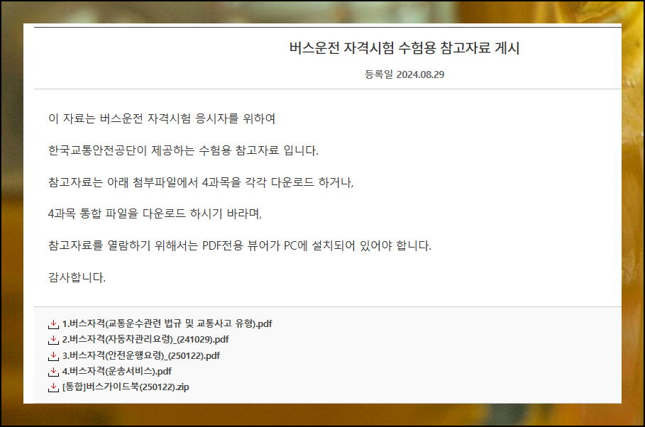 참고자료 게시판에서 수험용 자료를 확인할 수 있어요. 버스운송 자격시험 수험용 참고자료를 선택하면 필요한 내용이 나타납니다. 학습자료는 PDF 형식으로 제공되니 뷰어도 미리 설치해 주세요.