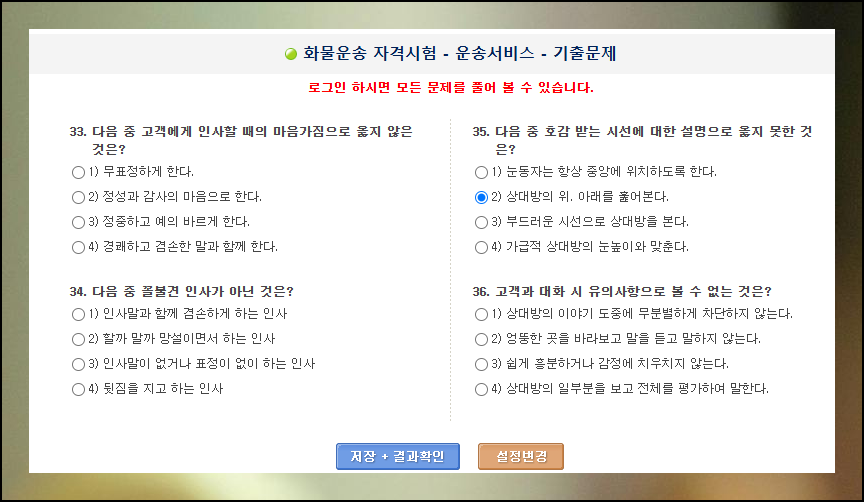 버스운송 자격시험의 과목 중 3과목이 화물운송 시험과 동일합니다. 교통 법규, 운송서비스, 안전운행 관련 문제들을 풀어보면서 버스 운전에 필요한 지식을 쌓아보세요.