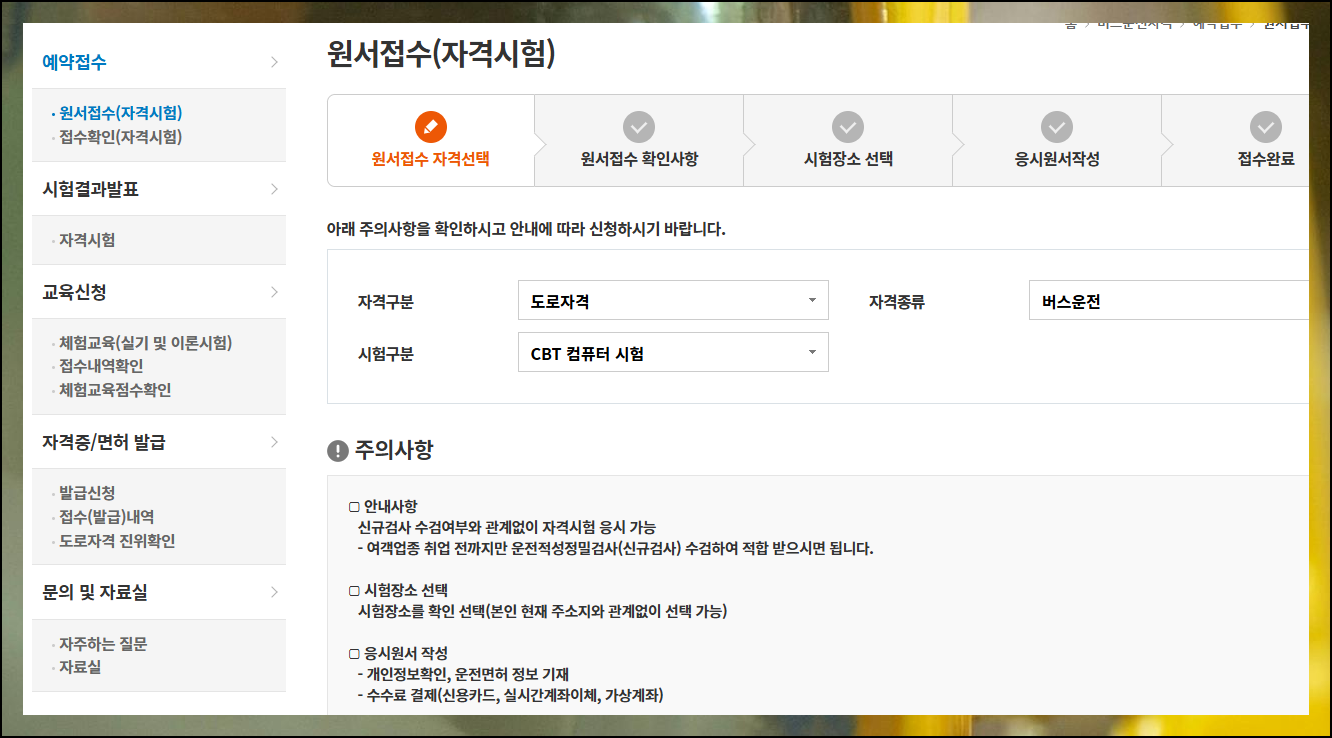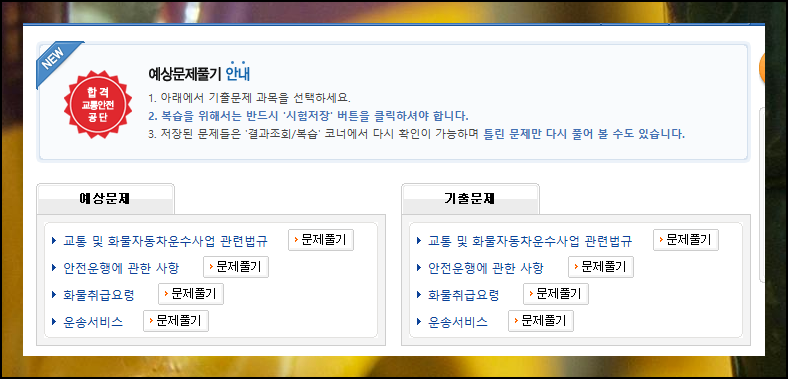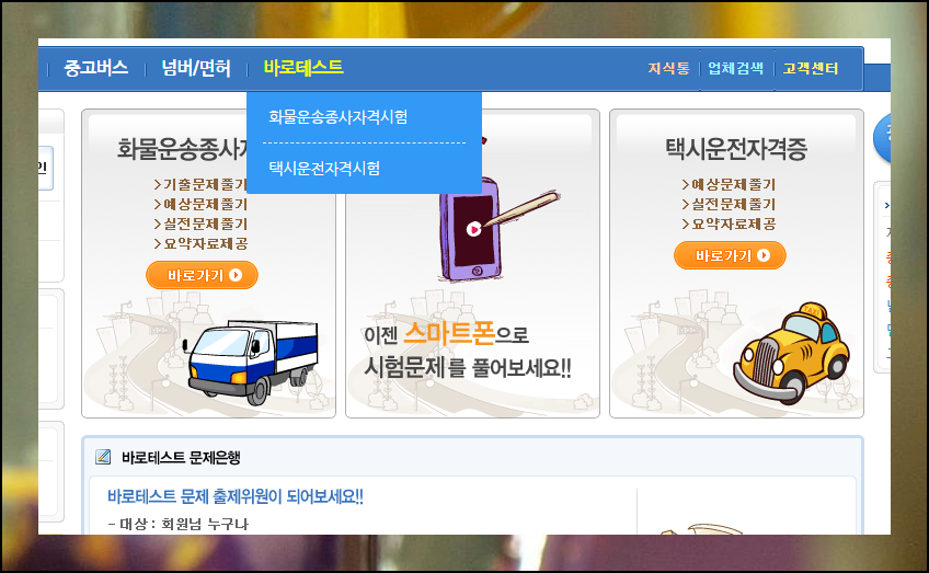 드라이버스 홈페이지 상단의 바로테스트를 클릭하세요. 운송종사자격증 항목에서 버스 관련 문제들을 만날 수 있습니다. 기출문제를 통해 시험 유형을 파악하는 것이 중요해요.