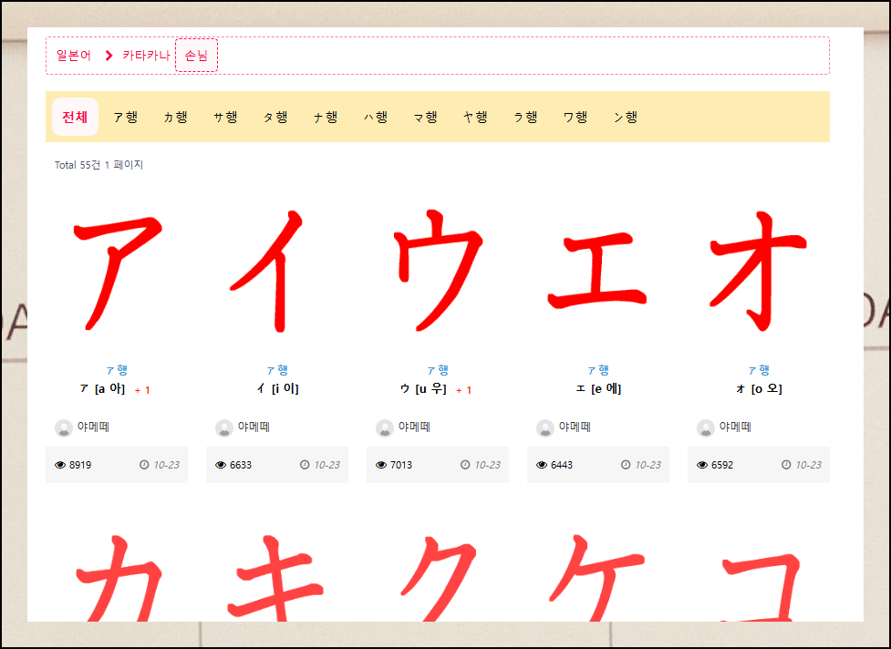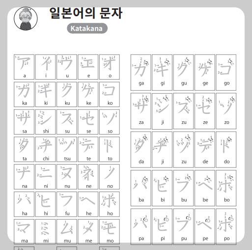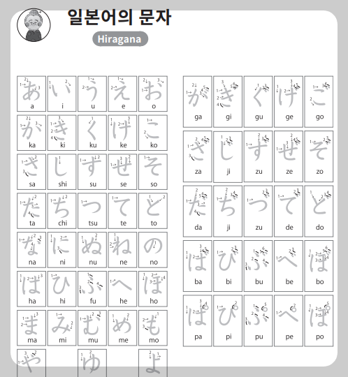 이 자료는 일본어 전문가가 직접 제작한 것으로, 문자의 모양과 쓰는 순서까지 한눈에 파악할 수 있어요. 여기에 무료 학습 사이트까지 알려드리겠습니다. 발음을 듣거나 무료 강의를 이용하여 혼자서도 충분히 공부하실 수 있을 거예요.
