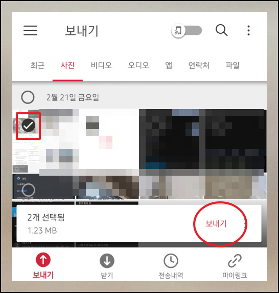 실행 화면에서 컴퓨터로 전달하고 싶은 사진을 선택해 주세요. 그럼 화면 하단 부분에 [보내기] 버튼이 나타납니다. 해당 버튼을 클릭해주세요. 전송 버튼을 누르면 숫자와 QR코드가 표시됩니다. 참고로 영상이나 문서도 같은 방법으로 옮길 수 있어요.