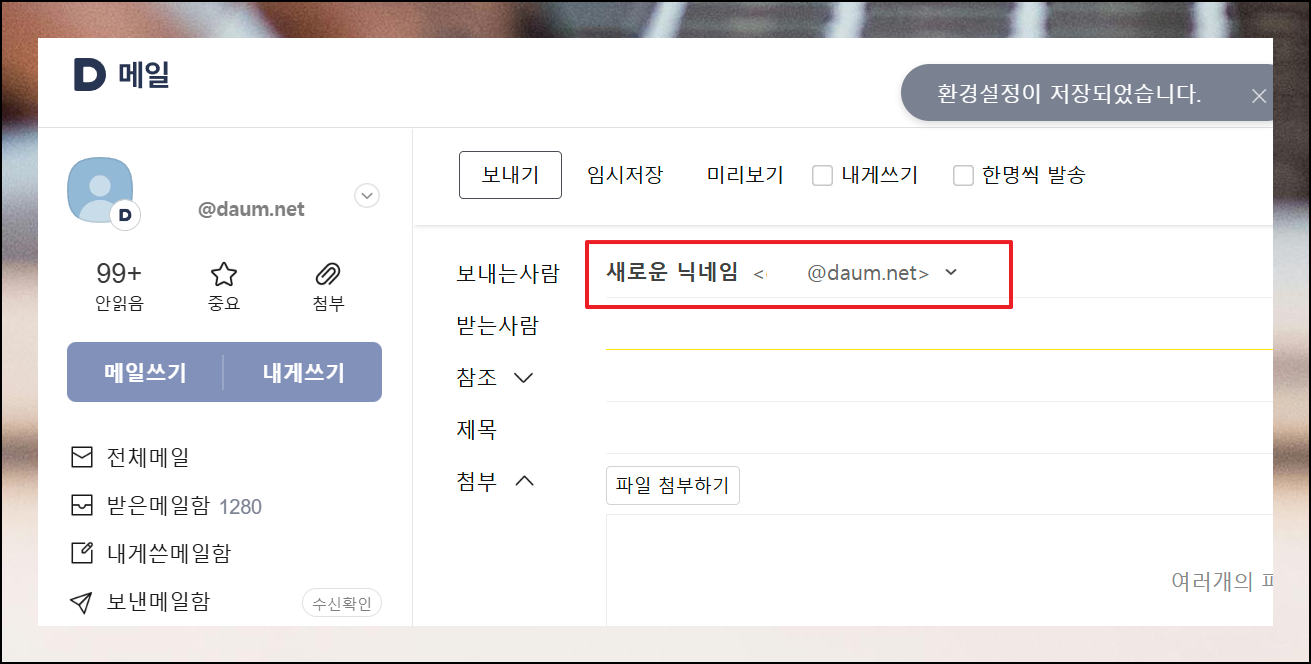 설정을 마친 후 [쓰기] 버튼을 다시 눌러보세요. 이제 표시명 항목에 새로 설정한 이름이 나타납니다. 이 호칭은 메시지 수신자에게도 동일하게 보여집니다. 이제 여러분이 지정한 닉네임으로 메일 전송을 할 수 있어요.