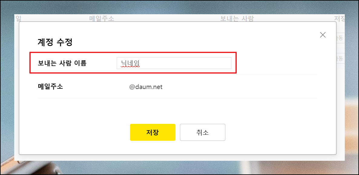 계정 수정 창에서 보내는 사람 이름을 원하는 닉네임이나 표시명으로 입력해보세요. 이름 변경방법은 복잡하지 않으니, 수신자에게 보여질 호칭을 센스있게 지정해보세요.