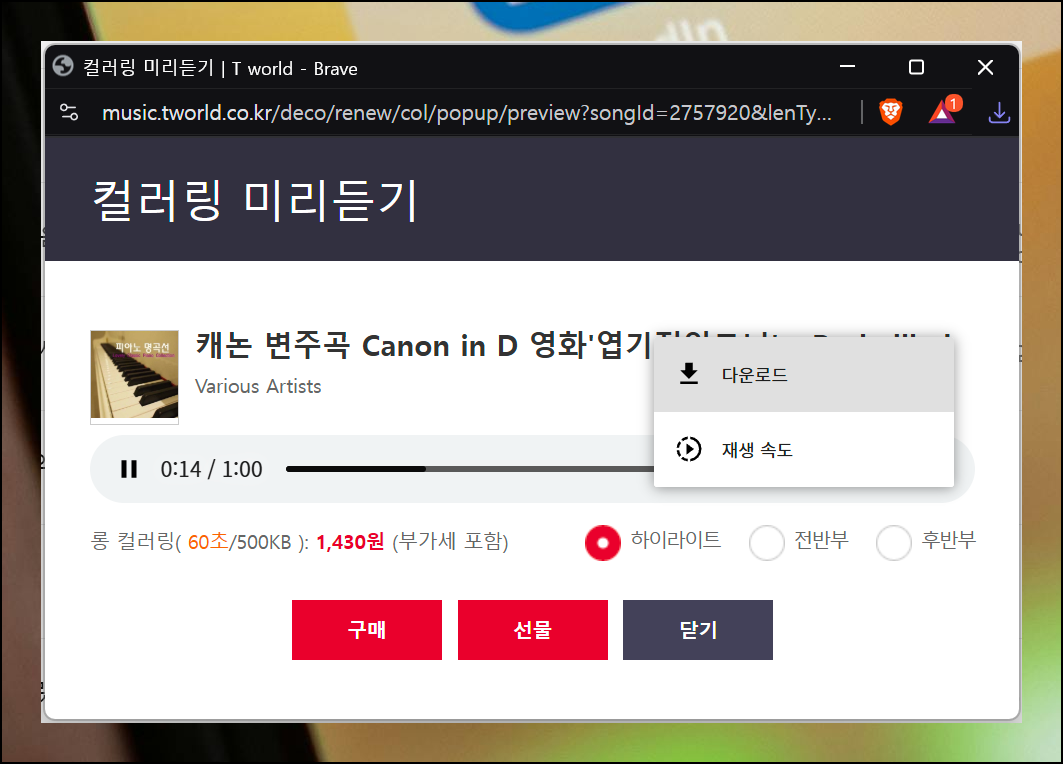 마음에 드는 음원을 발견했다면 [듣기] 버튼을 눌러보세요. 미리듣기 창에서 하이라이트, 전반부, 후반부 중 원하는 구간을 선택할 수 있어요. 마음에 들면 [구매] 버튼 한 번으로 휴대폰 컬러링 설정이 완료됩니다! 이 절차는 어떤 휴대폰에서도 동일한 방식으로 적용돼요.