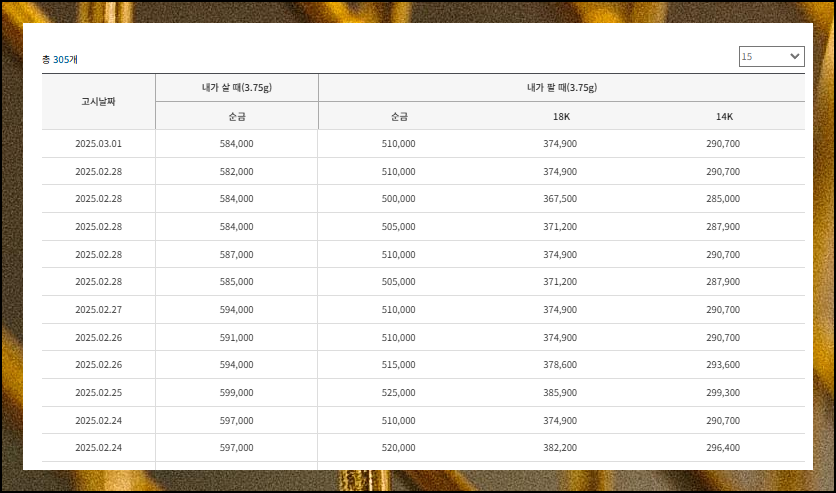 도표를 통해 금값에 대한 구매가와 판매가를 정확히 비교할 수 있어요. 매매별 시세 차이를 한눈에 확인할 수 있어 투자나 구입 또는 매각 결정에 도움이 됩니다. 매일 갱신이 되는 정보이오니 참고하세요.