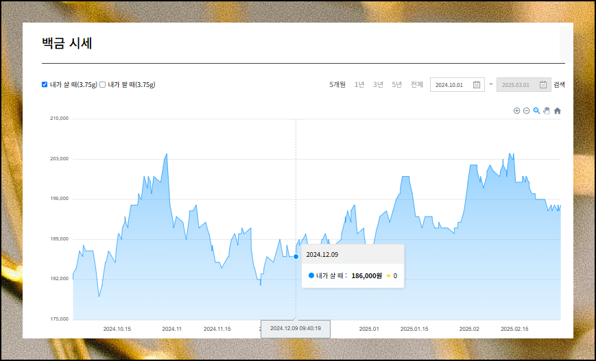 새롭게 열린 페이지에서는 일반적인 데이터와 동일하게 금값시세 그래프가 시간 순서가 좌측에서 우측으로 표시됩니다. 가격 변동 추이를 정확히 파악하려면 이 특성을 기억하세요. 이해하고 나면 금값의 오름세와 하락 경향을 더 쉽게 파악할 수 있어요.