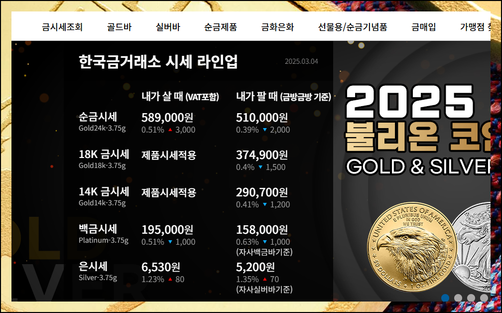 웹사이트에 접속하면 순금부터 18K, 14K, 백금, 은까지 다양한 귀금속 시세가 한눈에 들어옵니다. 매수가와 매도가 격차는 거래 수수료 때문인데요, 기본 표시 단위인 3.75g에서 10kg으로 환산하려면 약 2,667배를 곱하시면 됩니다. 이 간단한 산출법으로 대량 구매 시 금괴 구입 비용을 쉽게 계산할 수 있어요.
