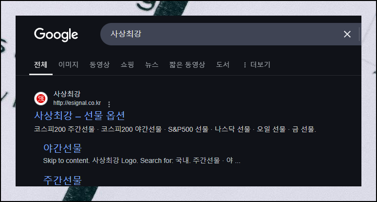 검색창에 사상최강을 입력하세요. esignal 플랫폼이 바로 나타나며, 실시간 야간선물지수를 쉽게 확인할 수 있습니다. 활용방법이 간단하고 다양한 분석도구를 제공해 투자 판단에 큰 도움이 됩니다.