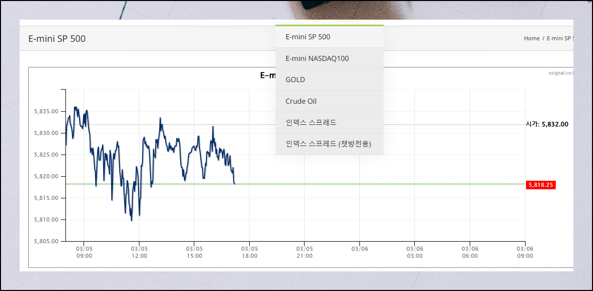 해외 선물거래 실시간 차트도 제공됩니다. E-Mini SP 500, E-mini NASDAQ100, GOLD 등 주요 해외 지수를 조회할 수 있어 글로벌 시장 동향을 파악하는 데 도움이 돼요.