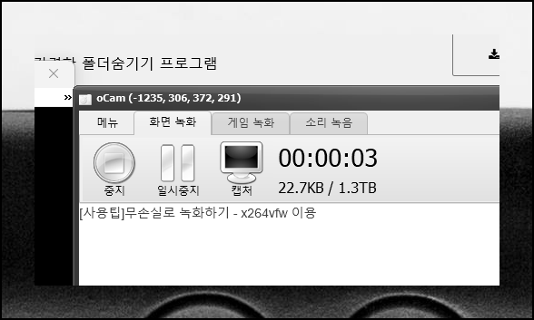 영역 설정이 완료되면 녹화는 매우 쉽습니다. 오캠의 화면 녹화 탭에서 중지, 일시중지, 캡처 등 다양한 기능 버튼을 확인할 수 있어요. 이 조작키들은 클릭 한 번으로 원하는 작업을 수행할 수 있도록 구성되었습니다.