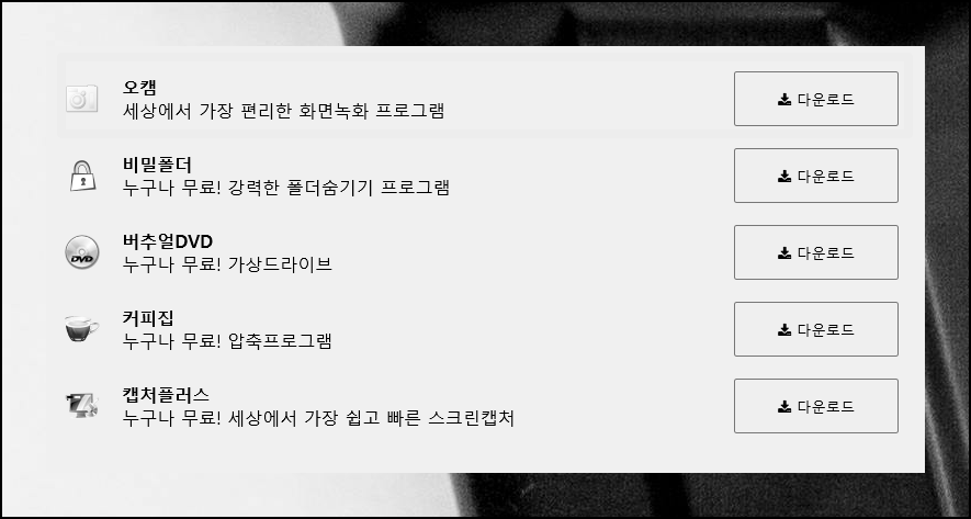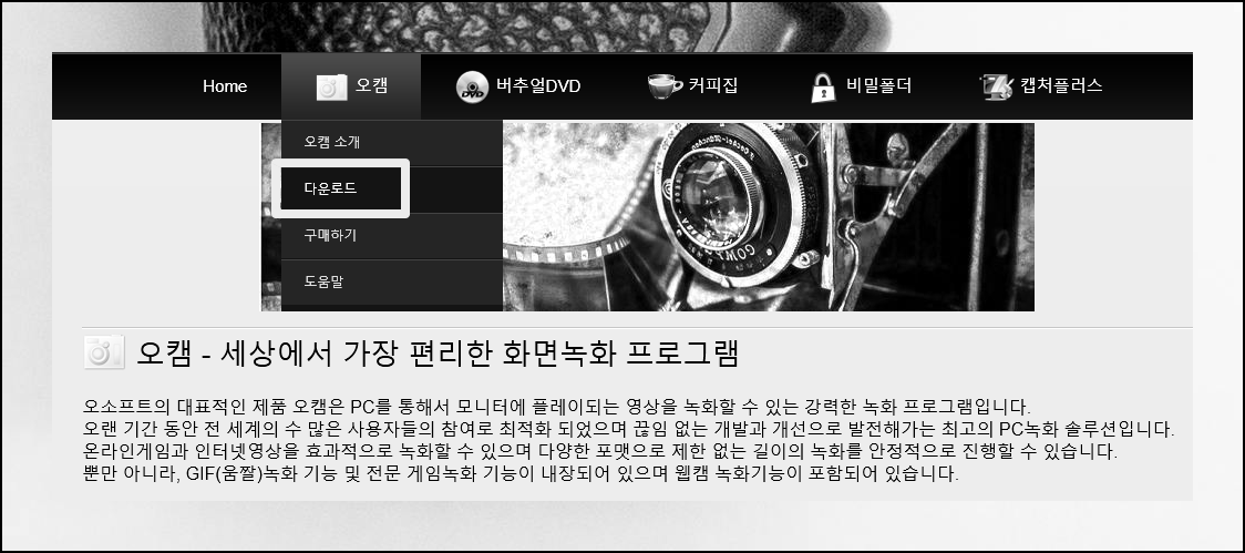 오소프트 웹사이트에서는 오캠, 버추어DVD, 비밀폴더, 캡쳐플러스 등 다양한 프로그램을 제공합니다. 노트북 화면을 동영상으로 기록하고 싶다면 메뉴에서 [오캠]을 선택하세요. 각 소프트웨어마다 특화된 기능이 있으니 필요에 맞는 도구를 골라 사용하면 됩니다.