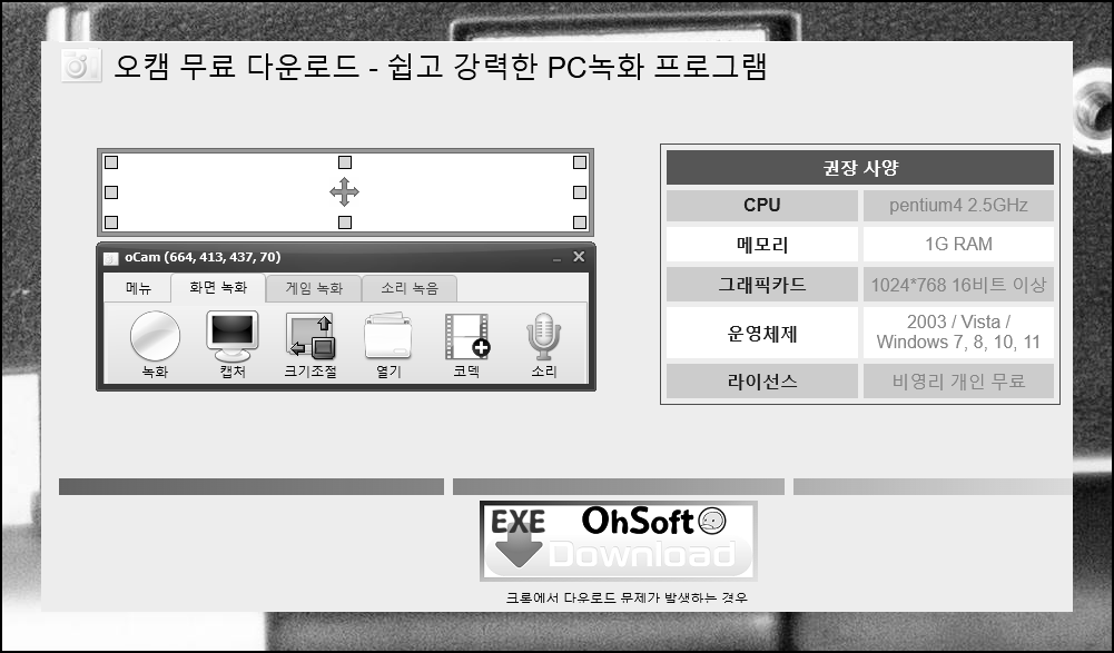 프로그램 설치는 공식 사이트에서 파일을 내려받아 실행하면 됩니다. 오캠의 시스템 요구사항이 높지 않아 오래된 윈도우7 PC에서도 무리 없이 작동해요. 필요한 CPU, 메모리, 그래픽카드, 운영체제 사양은 표를 참고하시면 됩니다. 무료 소프트웨어 중에서도 안정적인 성능을 보여주는 제품입니다.