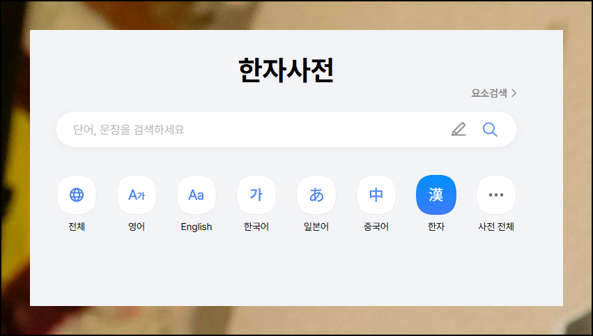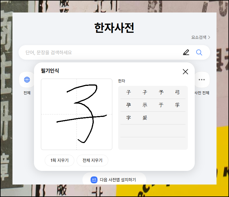 다음에서 제공하는 영한, 영영, 국어, 일본어, 중국어 등 다양한 사전 중 한자 번역기를 찾아보세요. 검색창 아래쪽에 위치해 있어요. 원하는 문자를 찾기 위해 이 기능을 선택하면 됩니다.