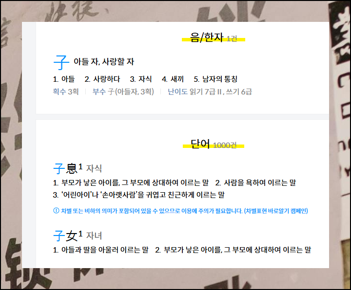 "아들 자(子)"와 같은 한문을 검색하면 이를 포함한 다양한 단어도 함께 볼 수 있어요. 개별 글자에 대해 자세히 알고 싶다면 결과 상단의 "음/한자" 부분을 클릭하세요. 다음 서비스를 통해 더 상세한 내용을 확인할 수 있습니다.