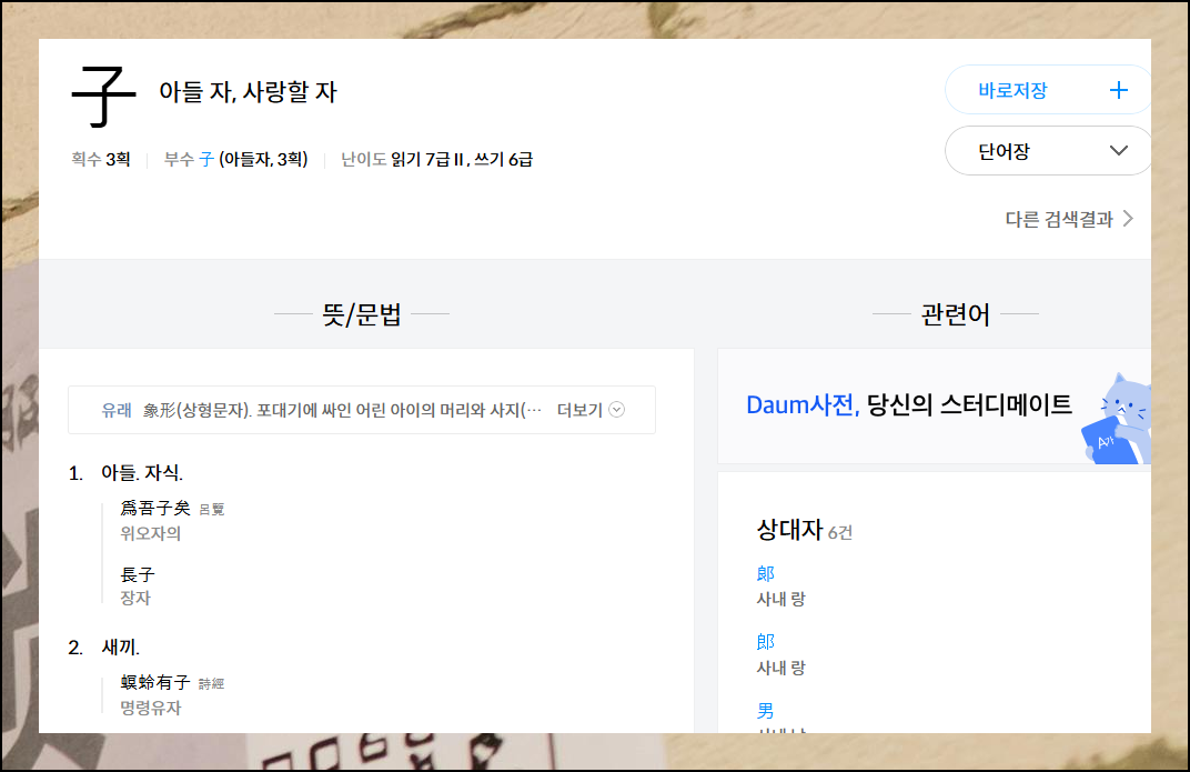 새 페이지에서는 한문의 획수, 부수, 난이도, 의미, 문법 등 다양한 정보를 제공해요. 다음 번역기의 단어장 기능도 유용합니다. 자주 틀리는 한자는 저장해두세요. 나중에는 재검색 없이 바로 불러올 수 있어 편리해요.