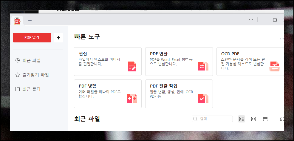 소프트웨어를 처음 구동하면 초기 화면이 나타납니다. 파일 열기 버튼을 클릭하여 수정하고자 하는 PDF 문서를 선택해주세요.