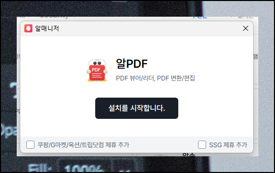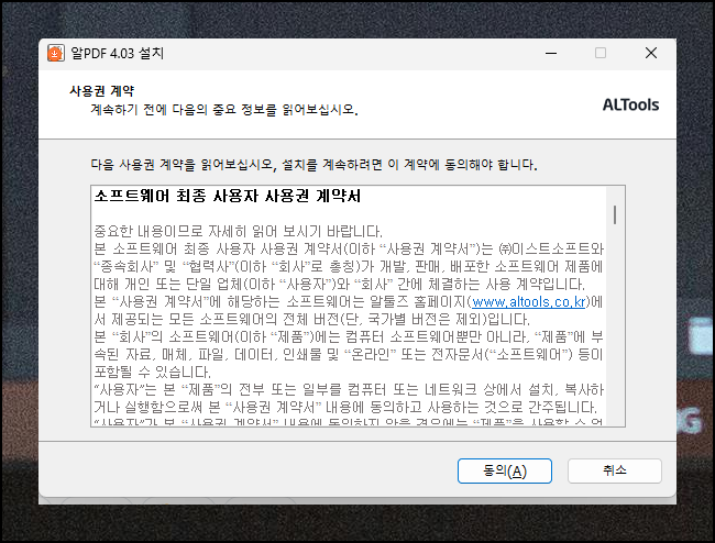 설치 파일을 실행하면 이용 약관이 표시됩니다. 내용을 확인하고 동의 버튼을 누른 후, 시작 버튼을 클릭하면 무료 PDF 편집 프로그램 설치가 진행됩니다.