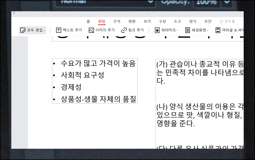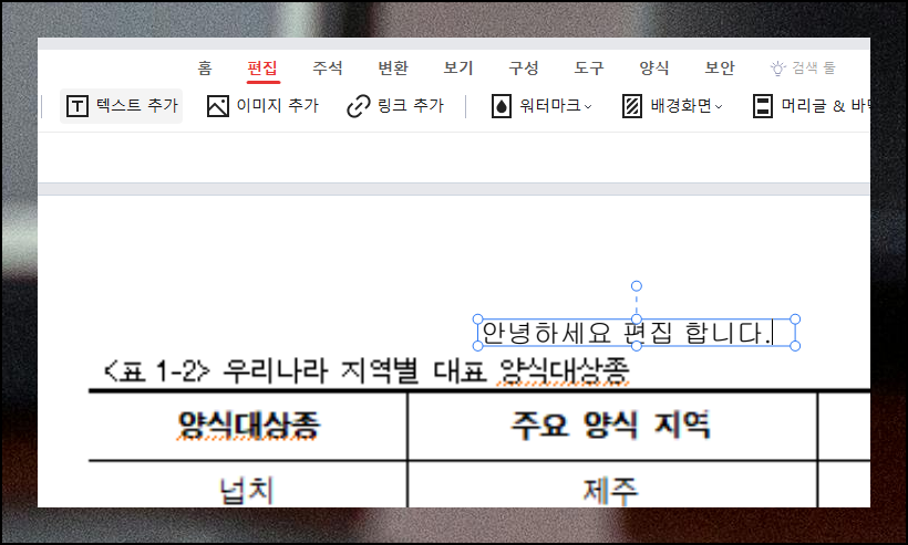 메뉴의 편집 버튼을 클릭하면 문서 내용을 변경할 수 있어요. 텍스트 수정, 폰트 변경, 이미지 추가, 링크 삽입, 워터마크 적용 등 여러 기능을 무료로 사용할 수 있습니다. 작업을 위해서는 상단의 "편집" 모드가 선택되어 있어야 해요.