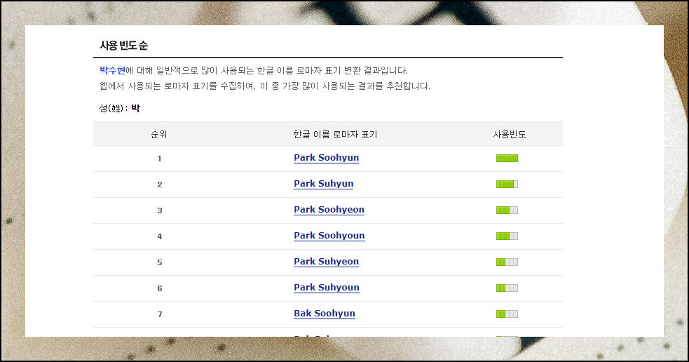 더보기 버튼을 누르면 사용 빈도 순으로 정렬된 페이지가 나와요. 여기서는 입력한 한글 성명의 실제 사용 빈도를 확인할 수 있습니다. '박수현'의 경우 'Park Soohyun'이 가장 많이 사용되는 것을 볼 수 있어요. 'Park SooHyun'이나 'Park SooHyeon' 방식도 자주 쓰입니다. 사용 빈도를 기준으로 선택하면 더 정확한 표현을 찾을 수 있어요.