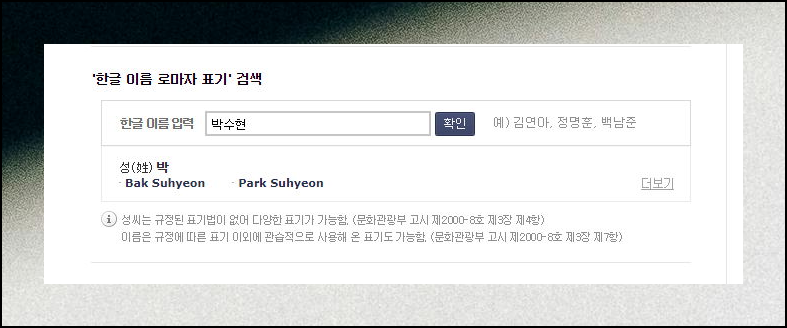 '박수현'이라는 한글 이름을 입력하면 'Bak suhyeon'과 'Park Suhyeon' 두 가지 표기법을 확인할 수 있어요. 일반적으로 '박'씨는 'Park'으로 많이 표기하지만, 어떤 영문 표현이 맞는지 헷갈릴 수 있습니다. 전환된 알파벳 형태가 어딘가 이상하게 느껴진다면, 프로그램 오른쪽에 있는 '더보기' 버튼을 활용해보세요.