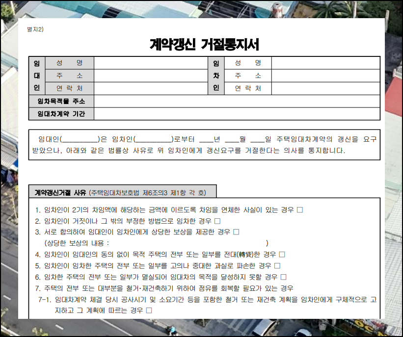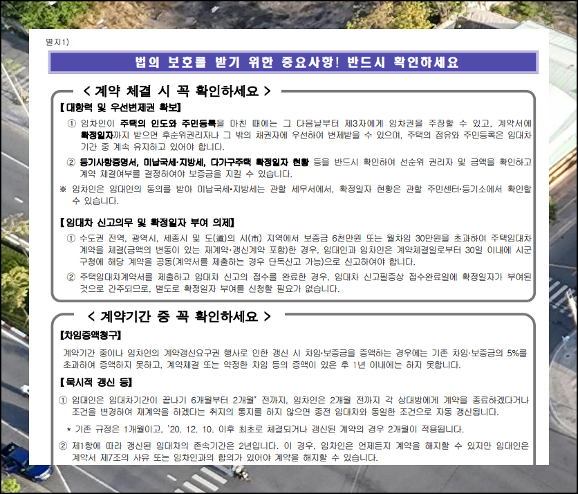 표준 서식의 뒷페이지에는 법적 보호를 받기 위한 주요사항이 기재되어 있습니다. 월세나 전세 임대 약속 전 반드시 읽어보세요. 또한 별지2에는 계약갱신 거절통지서 양식도 포함되어 있으니 필요할 때 이용하시기 바랍니다. 이런 정보를 제대로 이해하면 안전한 임대차 관계를 형성할 수 있습니다. 이렇게 모든 계약서 준비 시 중요 내용은 반드시 확인하세요.