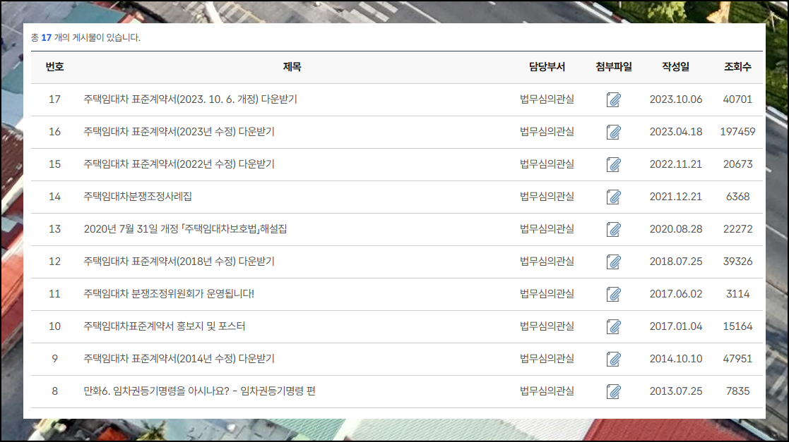 새로운 페이지에서는 표준 양식이 두 가지 버전으로 제공됩니다. 실제 활용할 [사용용] 파일을 클릭하여 무료로 다운로드하세요. hwp 파일 아래에는 자료 특징이 설명되어 있으니 참고하시기 바랍니다. [자료실] 항목을 클릭하면 다양한 계약서 개정본이 올라간 게시판이 나타납니다. 여기서 가장 최근 게시물을 선택하면 최신 임대차 서식을 구할 수 있습니다.