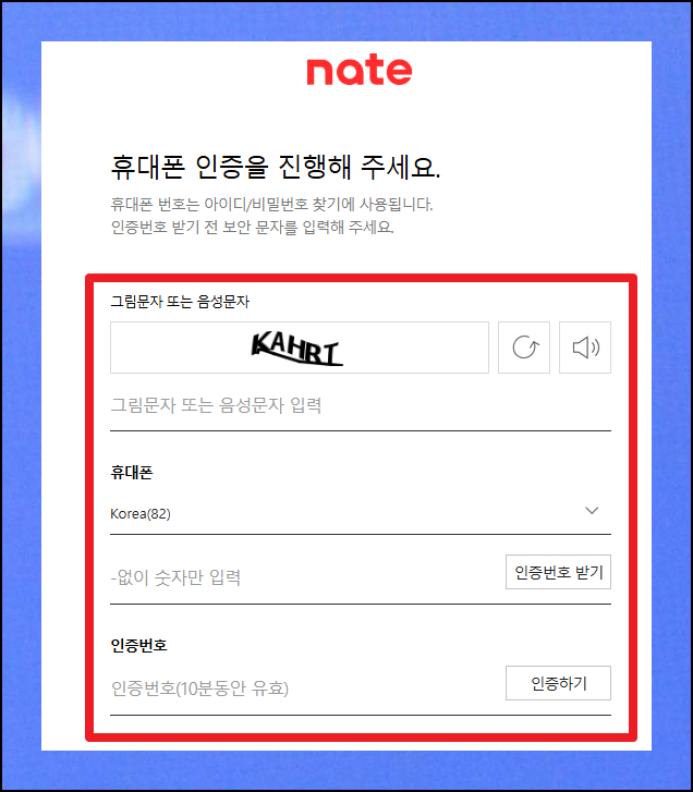 이제 휴대폰으로 본인 확인을 진행할 차례입니다. 화면에 나타난 그림문자나 음성문자를 입력하고, 모바일 번호와 문자로 받은 인증코드를 차례대로 입력하면 됩니다. 이 과정은 보안을 위한 필수 단계예요.