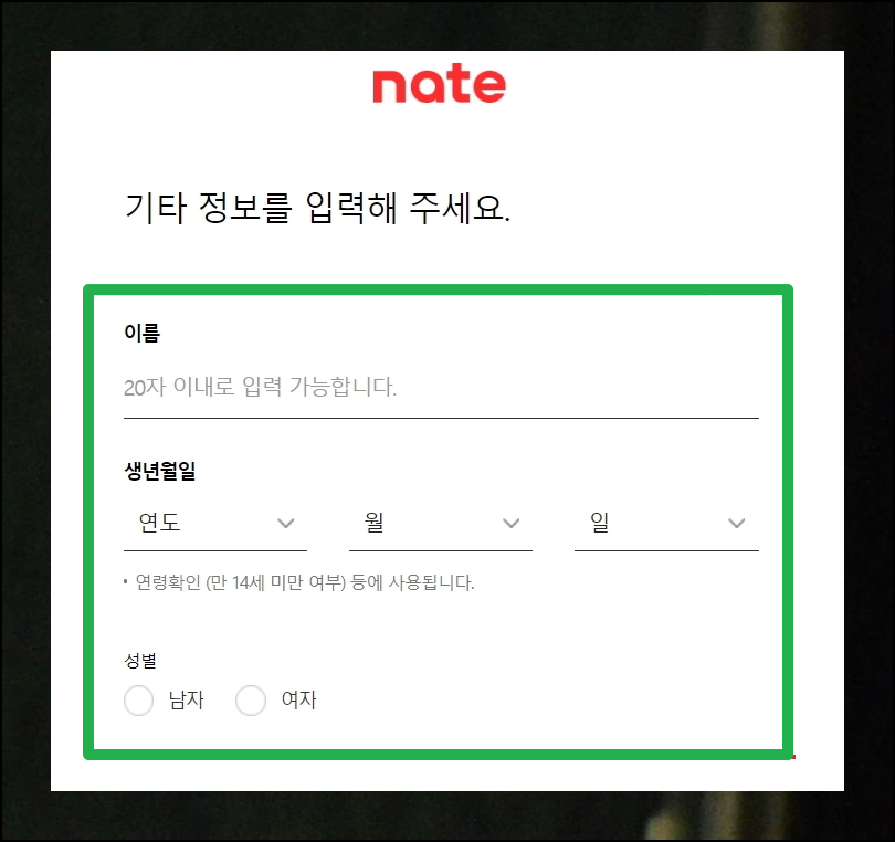 이름, 생년월일, 성별 등의 기본 데이터를 입력합니다. 이 정보는 사이트 활용과 계정 보안에 중요하게 쓰이니 정확한 내용을 입력하는 것이 좋습니다.