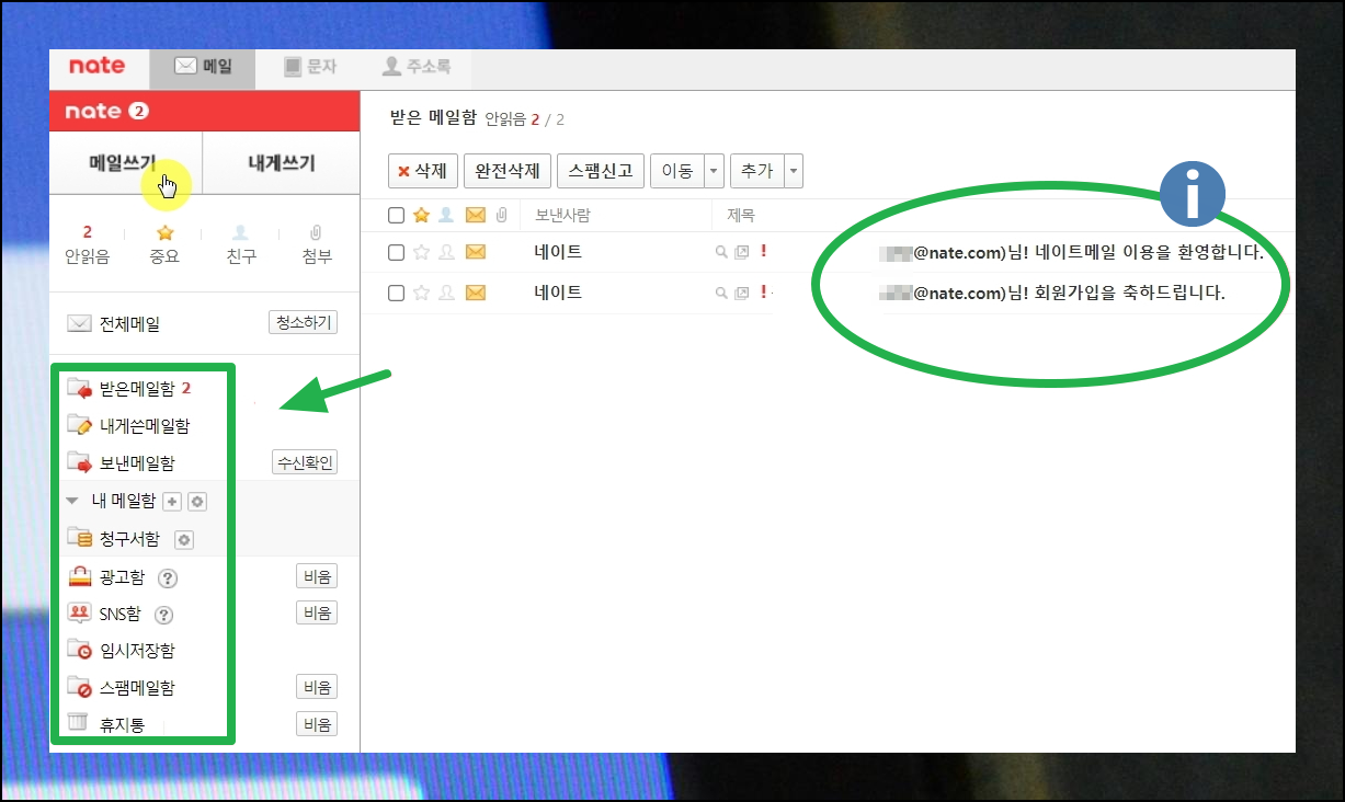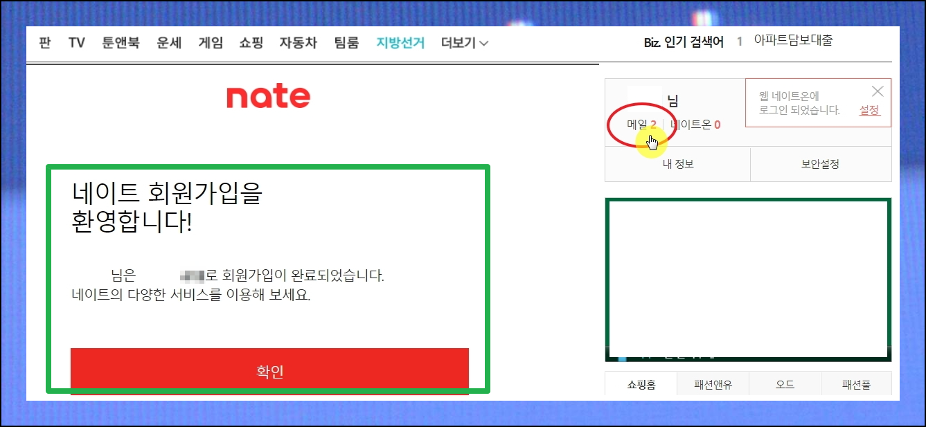회원가입이 완료되었습니다. 이제 네이트에 로그인하고 상단의 [메일] 버튼을 눌러보세요. 이 기능으로 여러분의 새 이메일 서비스에 접속할 수 있습니다.