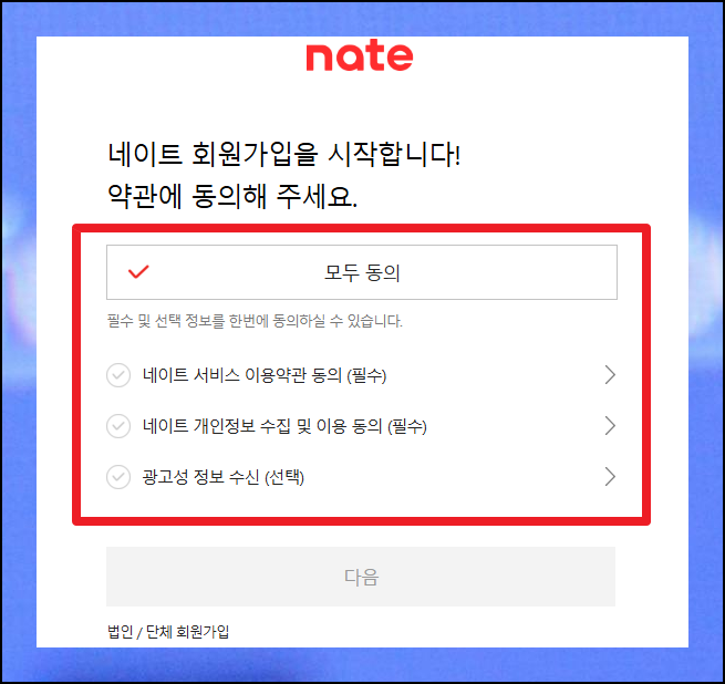 네이트 회원이 되면 자동으로 메일 계정이 생성됩니다. 가입 절차에서 필수 약관에 동의해야 하는데요, 서비스 이용과 개인정보 보호에 관한 중요한 내용이니 꼼꼼히 살펴보고 진행하세요.