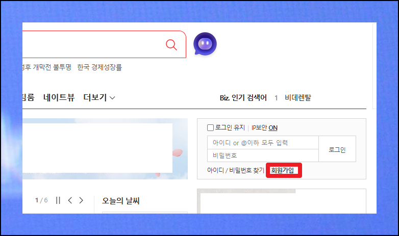 네이트 공식 웹사이트에 접속하면 오른쪽에 로그인 공간이 보입니다. 아직 계정이 없으니 여기서 [회원가입] 버튼을 클릭해 주세요. 이 단계로 이메일 주소 생성 여정이 시작됩니다.