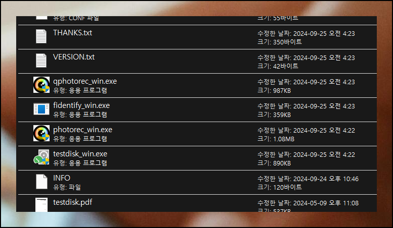 받은 압축 파일을 반디집이나 알집으로 풀어주세요. 여러 항목 중 'qphotorec_win' 파일을 실행하면 됩니다. 별도 설치 과정 없이 바로 사용할 수 있어 컴퓨터에 익숙하지 않은 분들도 쉽게 시작할 수 있어요.