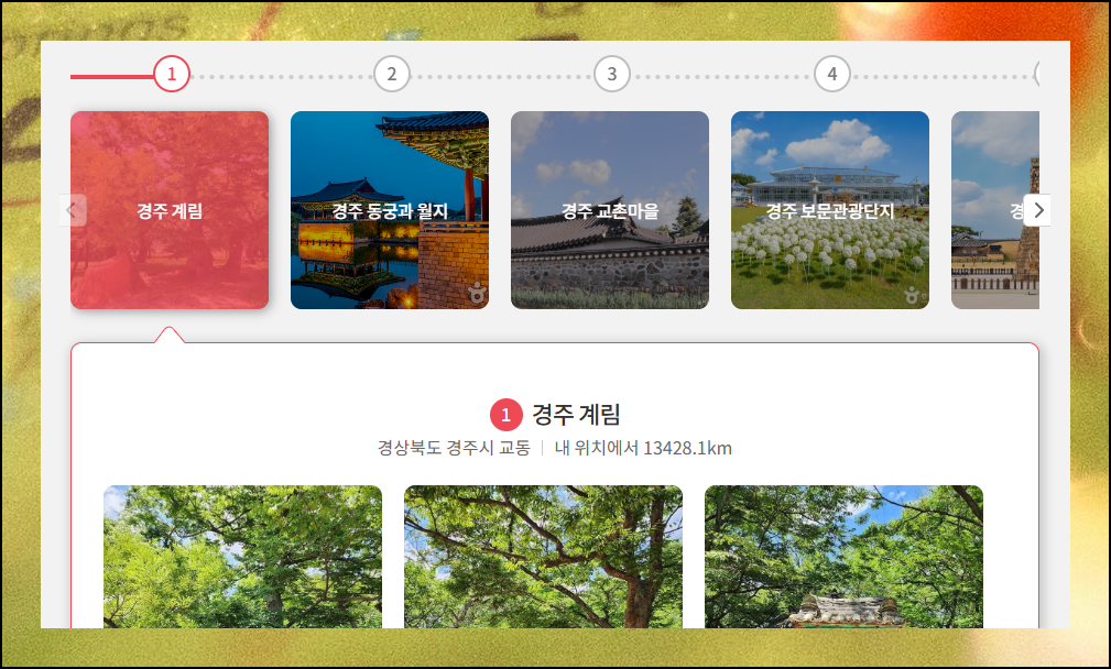 온라인 사이트에서는 경주의 주요 관광지를 효율적으로 둘러볼 수 있는 맞춤형 코스를 제공하고 있어요. 방문 시기, 동행자, 취향에 따라 다양한 테마의 추천코스를 선택하실 수 있답니다. 게다가 실시간 후기와 편의시설 정보까지 함께 확인할 수 있어 더욱 알찬 여행을 준비하실 수 있어요.
