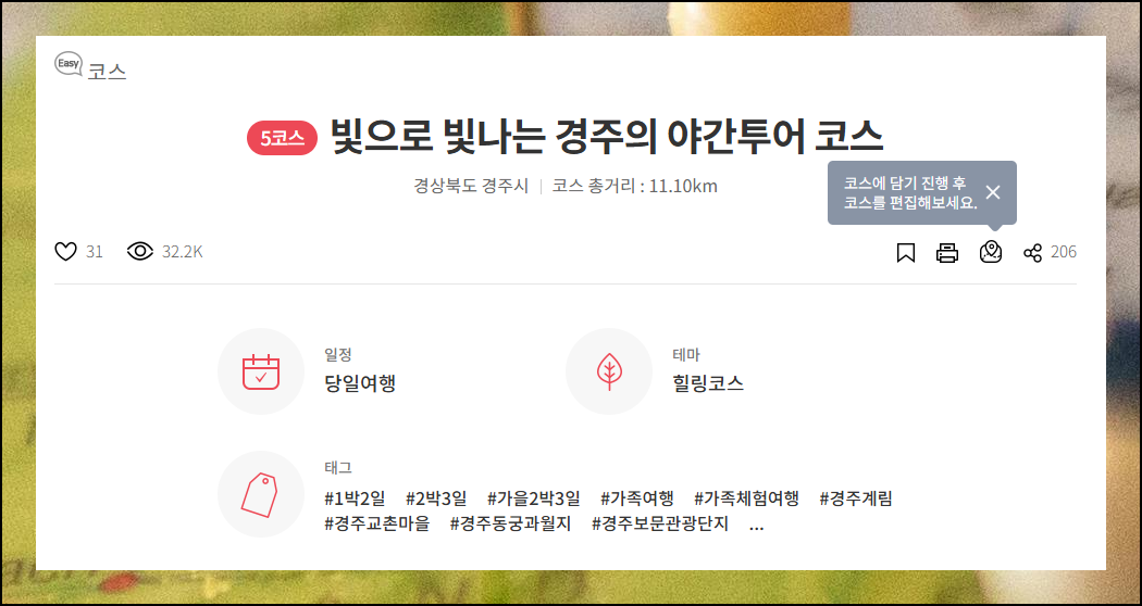 검색 결과를 인기순으로 분류하면 방문객들에게 좋은 평가를 받은 추천 여정부터 볼 수 있습니다. "빛으로 빛나는 경주의 야간투어 추천코스"처럼 특별한 체험을 선사하는 일정을 찾아보세요. 밤에 더 아름다운 고도의 모습을 만나볼 수 있어요.