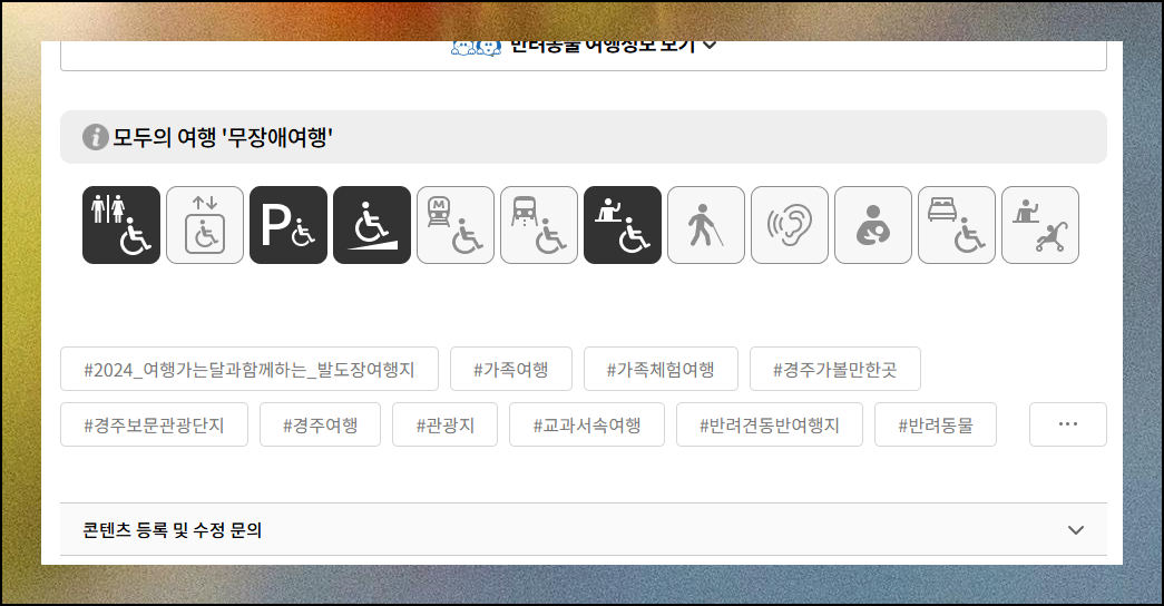 무장애여행 관련 안내도 아이콘으로 쉽게 확인할 수 있어요. 휠체어 이용자, 영유아 동반 가족, 노약자 등 누구나 편안하게 역사 도시를 둘러볼 수 있도록 도와주는 세심한 정보가 제공됩니다.
