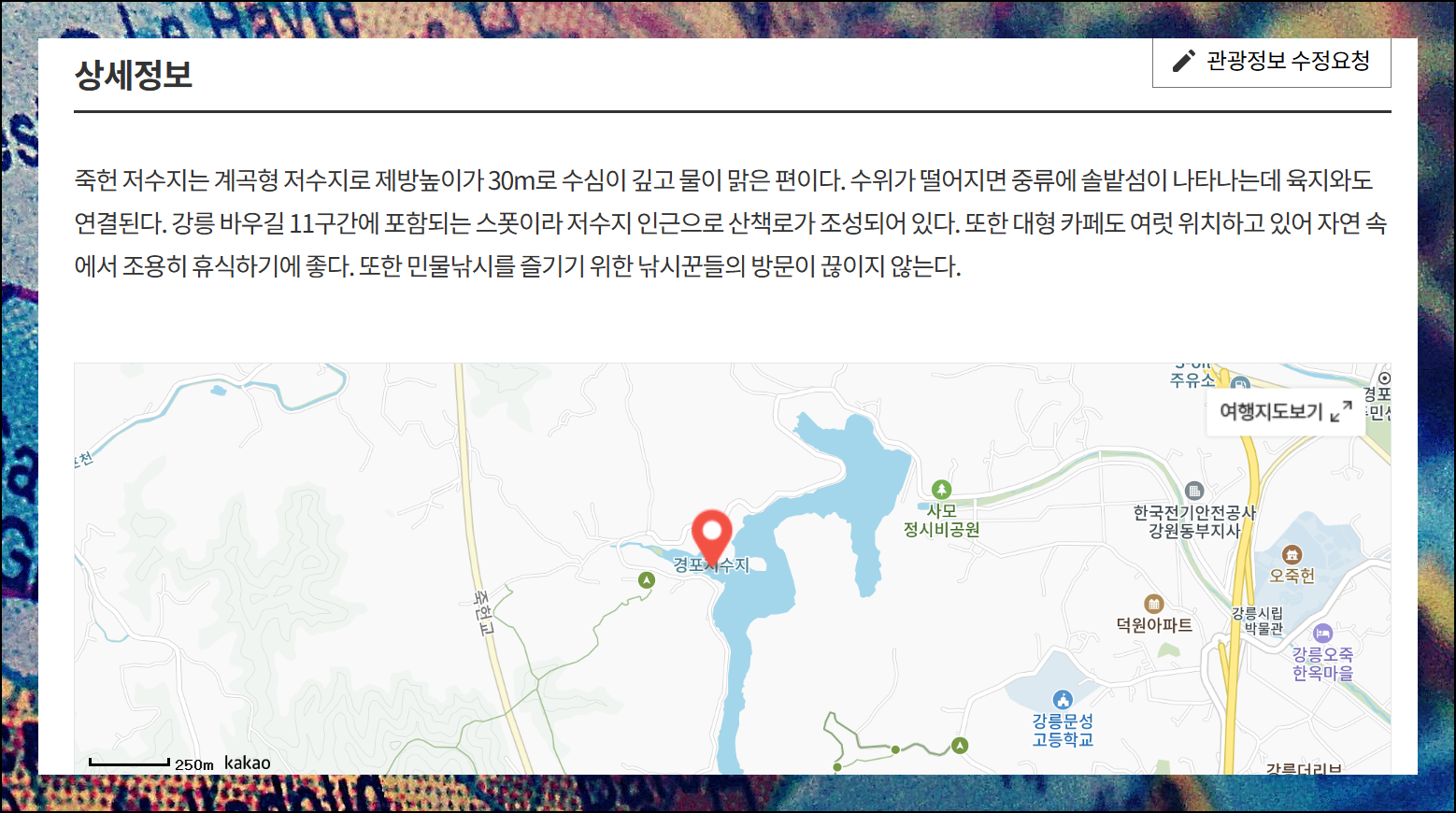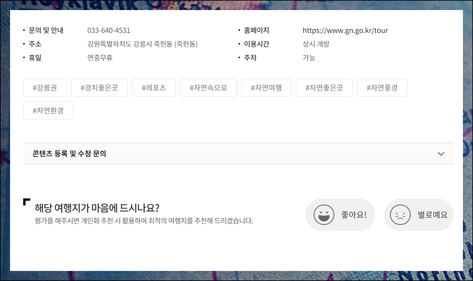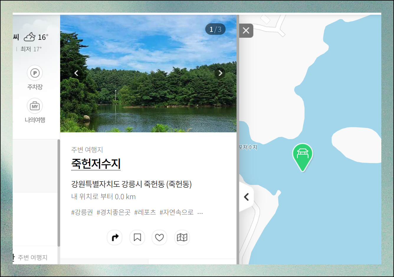 강원 강릉시 죽헌저수지를 예로 들면, 클릭 시 새로운 페이지에서 많은 사진, 상세설명, 여행톡, 추천 여행 정보를 확인할 수 있습니다. 직접 방문한 것 같은 경험을 제공합니다.