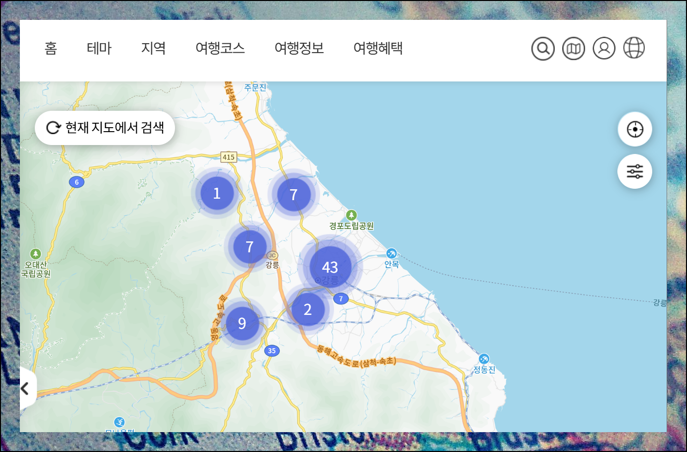 관광지도 페이지에서는 우리나라 지형이 표시됩니다. 관심 있는 지역을 찾아 우측 상단의 재검색 버튼을 클릭하면 해당 지역의 관광명소 개수가 숫자로 표시됩니다. 이를 통해 지역별 볼거리를 한눈에 확인하기 좋습니다.