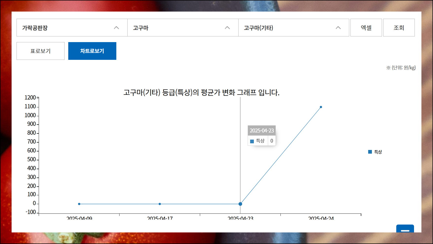 그래프 기능을 활용하면 농산물 가격 변동 패턴을 시각적으로 확인할 수 있어요. 날짜별 금액 추이를 차트로 보면 시간에 따른 시세 변화를 쉽게 이해하고 구매 시점을 전략적으로 결정할 수 있습니다.