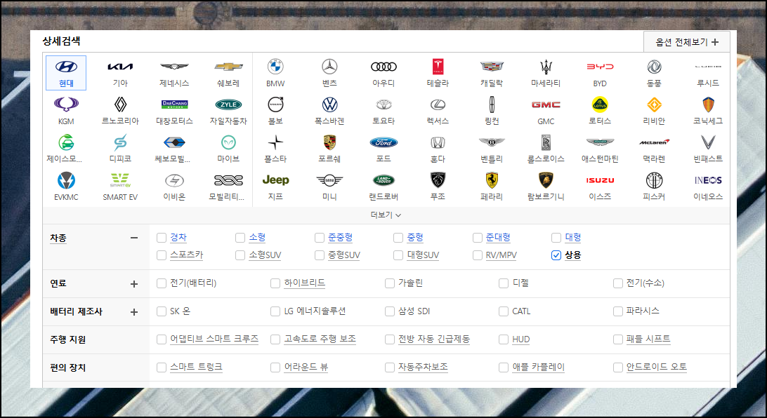 모델 상세검색 기능에서 제조사는 '현대'로, 차종은 '상용'으로 설정하면 현대상용차 목록이 나타나요. 연료 타입, 주행 지원 기능, 편의장치 등의 추가 사양은 개인 선호도에 맞게 선택할 수 있습니다.