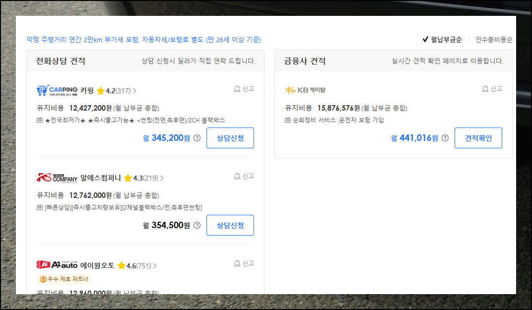 가격표 하단부에는 여러 리스 회사 정보가 나열됩니다. 각 업체별 특전, 추가 상품, 비용 등을 세밀히 비교하여 원하는 곳을 선택하세요.