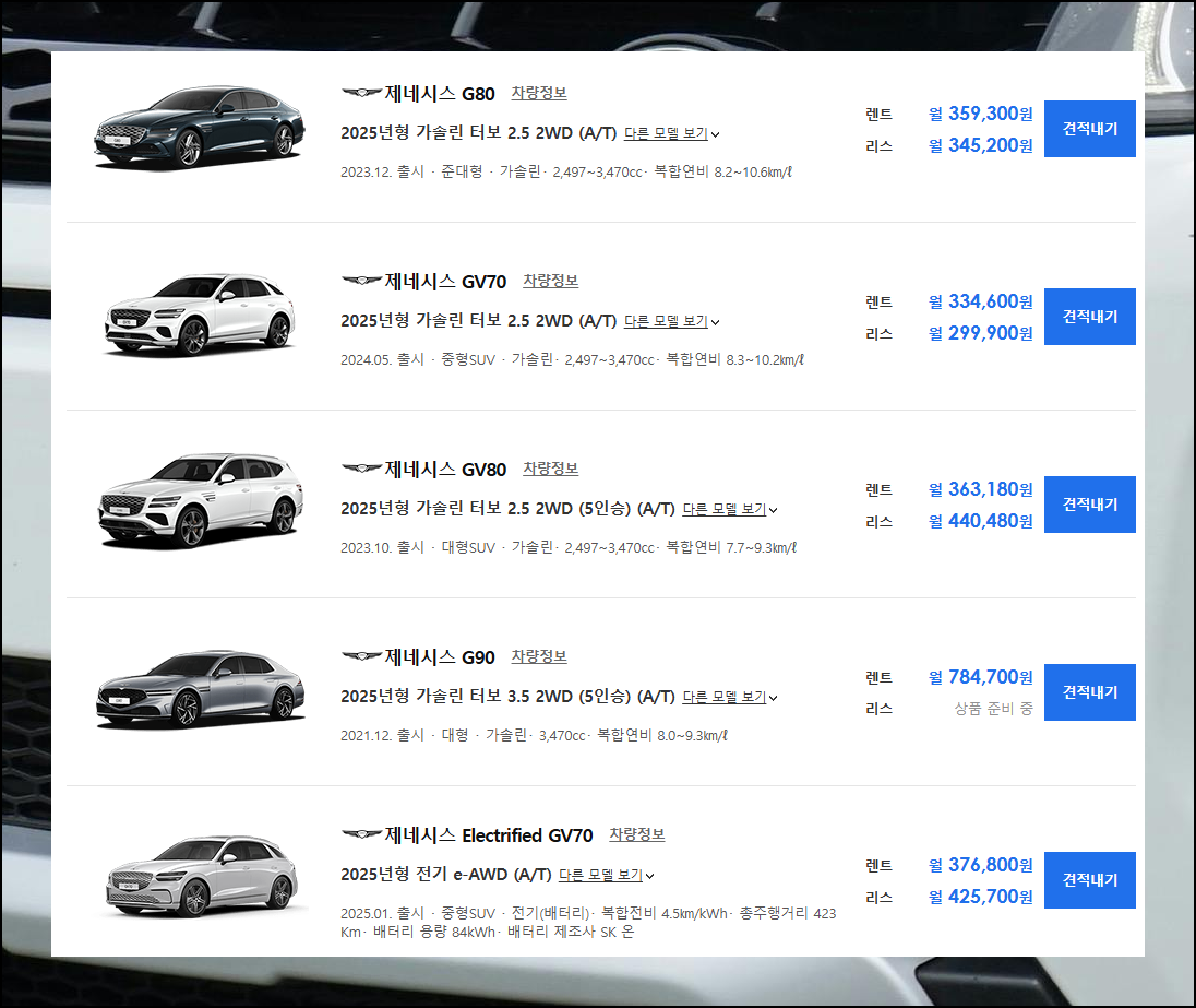 제네시스 차량의 경우 업체마다 제공하는 서비스가 달라 가격표 외에도 부가 혜택을 살펴보는 것이 유리합니다.