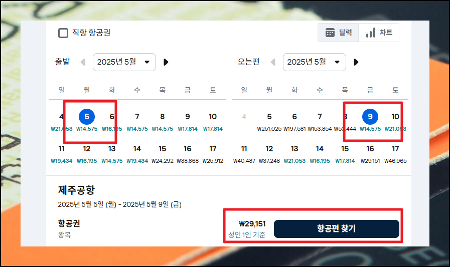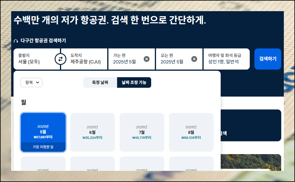 검색 후 나타나는 달력형 가격표는 각 날짜의 최저가 항공권의 금액이 표시되어 있습니다. 이 정보를 참고해 여행 일정을 조정하면 상당한 비용을 절약할 수 있어요.