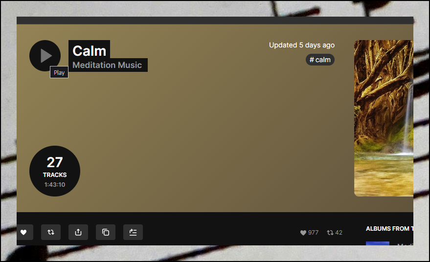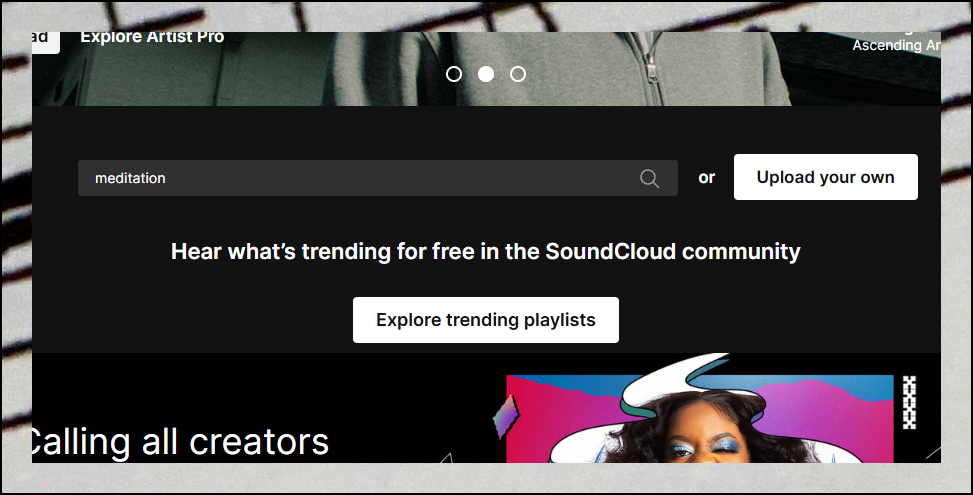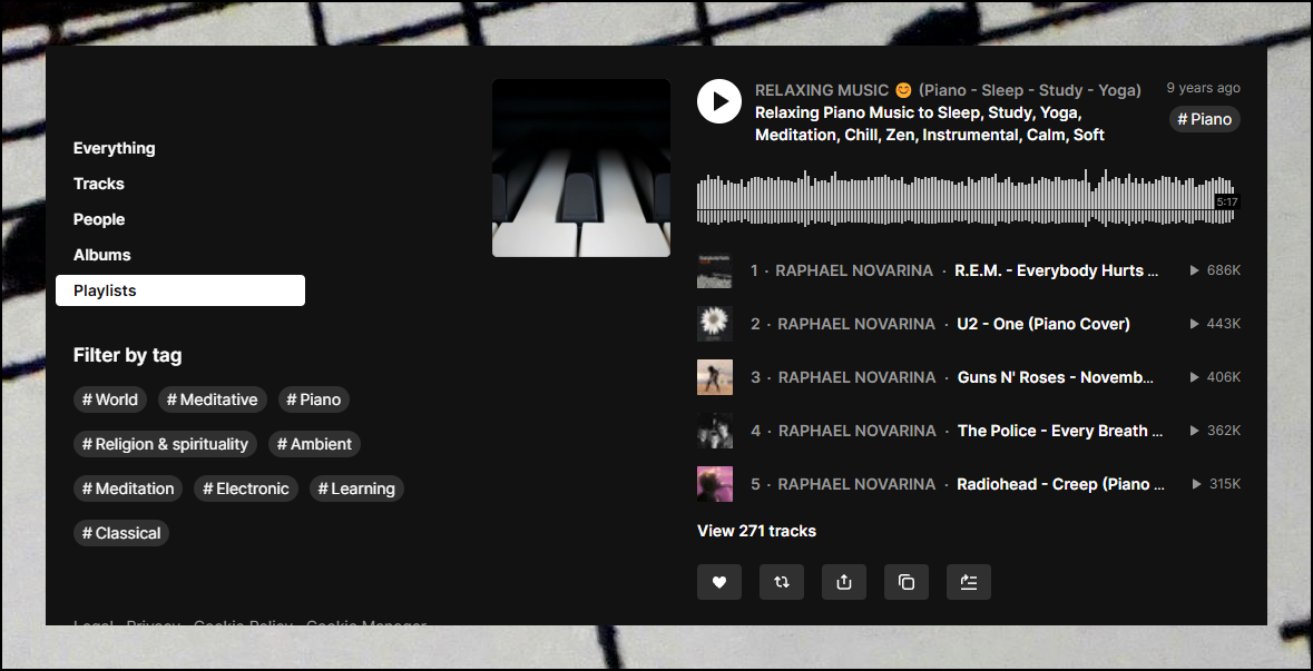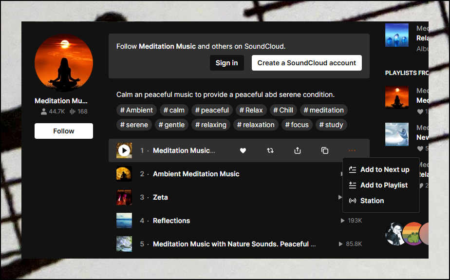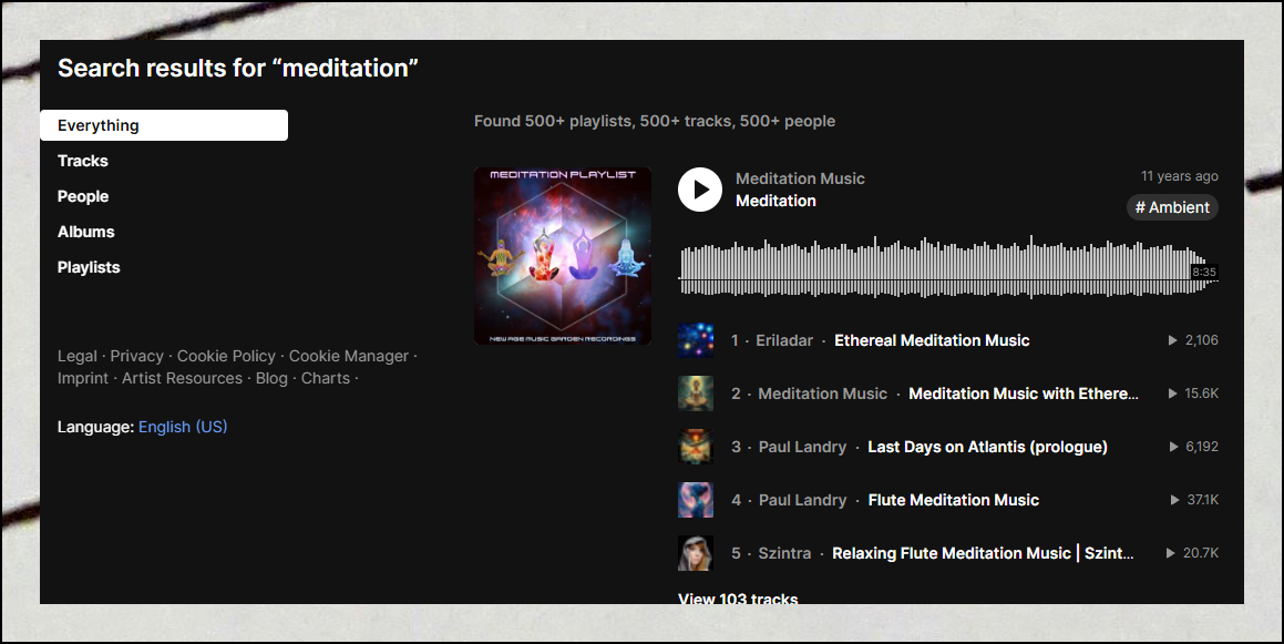 사운드클라우드에서 무료로 즐길 수 있는 명상트랙은 500개가 훨씬 넘습니다. 시스템에서는 "500+"로만 표시되어 정확한 숫자는 파악할 수 없지만, 양이 정말 방대해요.