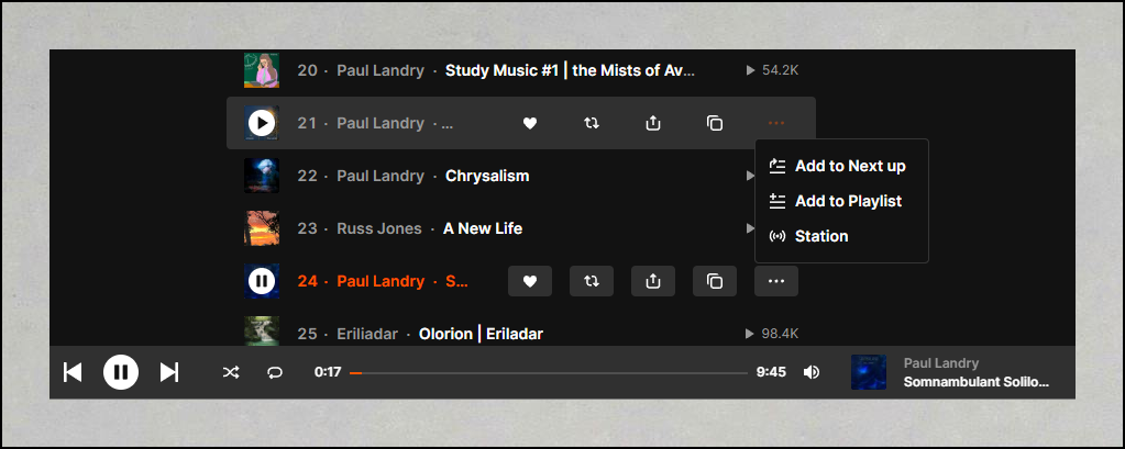 마음에 드는 곡만 골라 나만의 플레이리스트를 구성할 수도 있습니다. 이 기능은 로그인이 필요한데요. 옵션 버튼에서 "Add to playlist"를 선택하면 간편하게 만들 수 있어요.