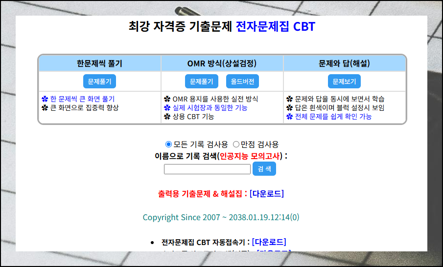 '전자문제집 CBT 온라인 모의 테스트' 기능을 사용하면 인쇄 없이 사이트에서 바로 테스트 진행이 가능해요. 하나씩 풀거나 실제 시험처럼 OMR 방식으로 응시할 수 있습니다.