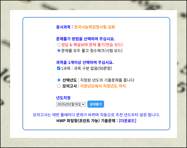 과목 선택 후에는 풀이 방법과 연도를 지정해요. '연습모드'에서는 해설을 보며 기출문제를 풀고, '시험모드'에서는 모든 문항을 풀고 한꺼번에 채점받을 수 있습니다. 자신의 학습 단계에 맞게 선택하세요.