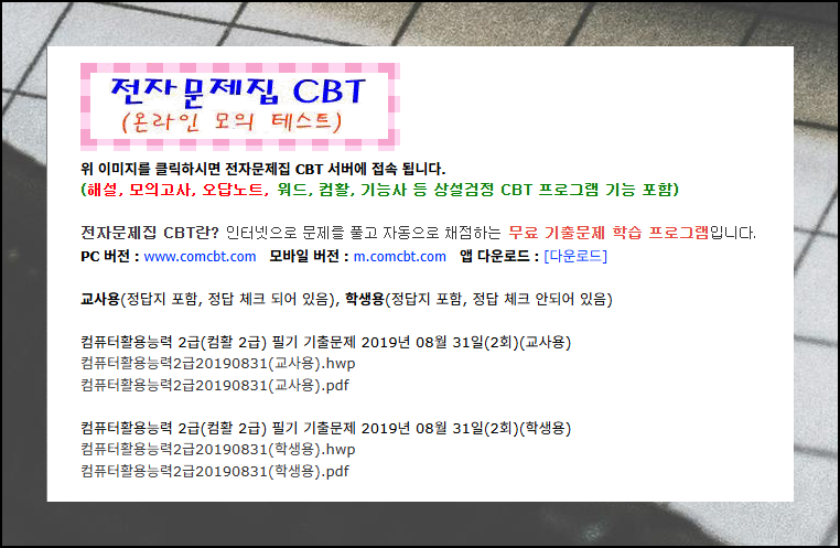 해당 사이트에서는 교사용, 학생용, 해설집 등 다양한 형태의 무료 기출문제 자료를 제공하여 학습 단계에 맞게 선택할 수 있어요. 특히 컴퓨터 활용능력이나 정보처리기사 같은 인기 자격증은 최신 지료까지 만나볼 수 있습니다.
