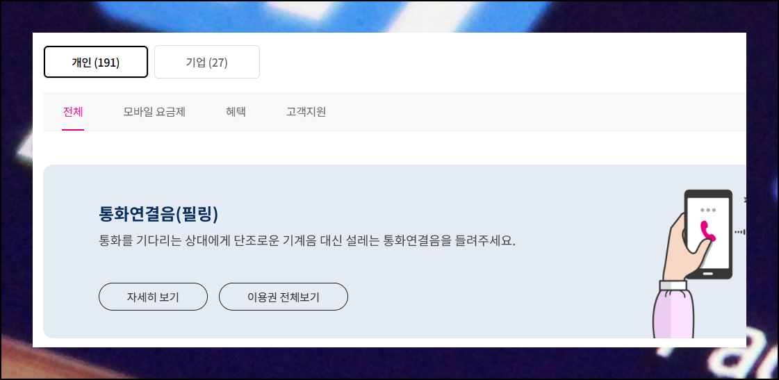 검색 결과에서 통화연결음 서비스 안내를 확인해보세요. 단조로운 신호음 대신 나만의 음악을 지정할 수 있는 LG 컬러링 서비스를 발견하실 거예요.