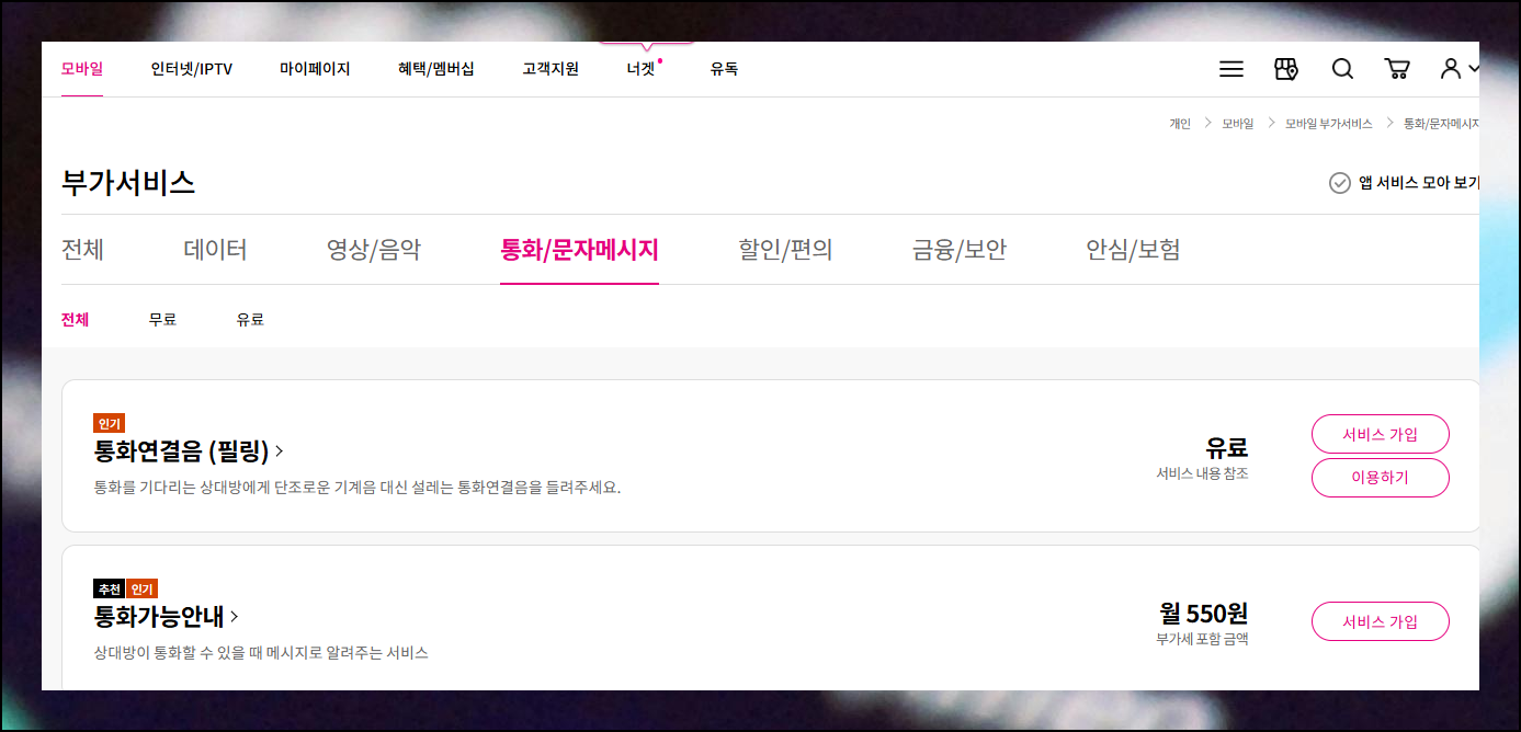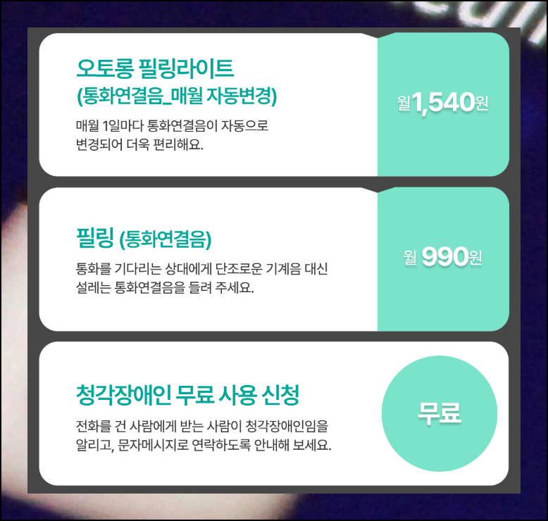 새 페이지에서는 요금제 정보를 확인할 수 있어요. 월 990원의 기본 비용이 발생하는데요. 오토롱 서비스라고 해서 매월 1일마다 통화연결음이 자동으로 변경되는 것도 있습니다.